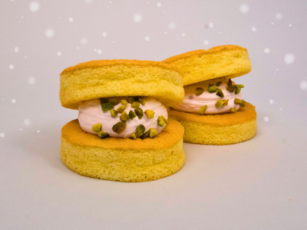 ふわふわのパンケーキに、甘さ控えめのホイップをサンド。フレッシュ感のあるいちごクリームと、ピスタチオのコクの冬の王道ペアリングは華やかで女性人気の高い組み合わせです。